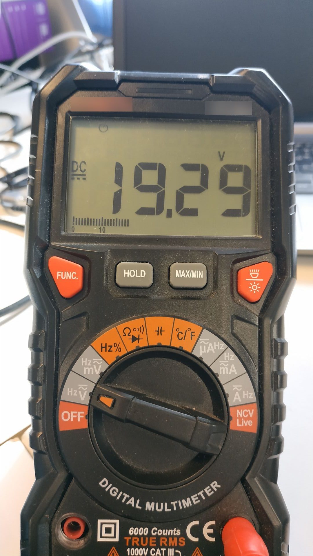 Première étape avant le démontage du PC : la vérification du chargeur. ici, la tension délivrée est correcte.