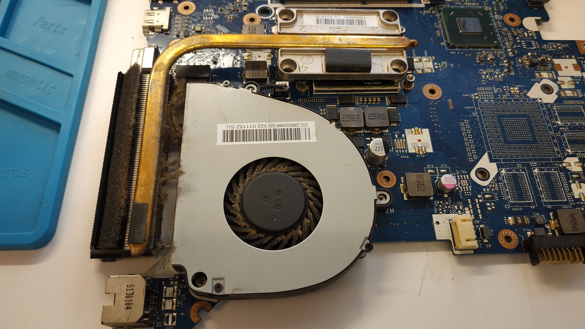 L’inspection visuelle montre aussi que le système de refroidissement est poussiéreux. Nous allons en profiter, tant que la carte mère est démontée, pour nettoyer l’ensemble.